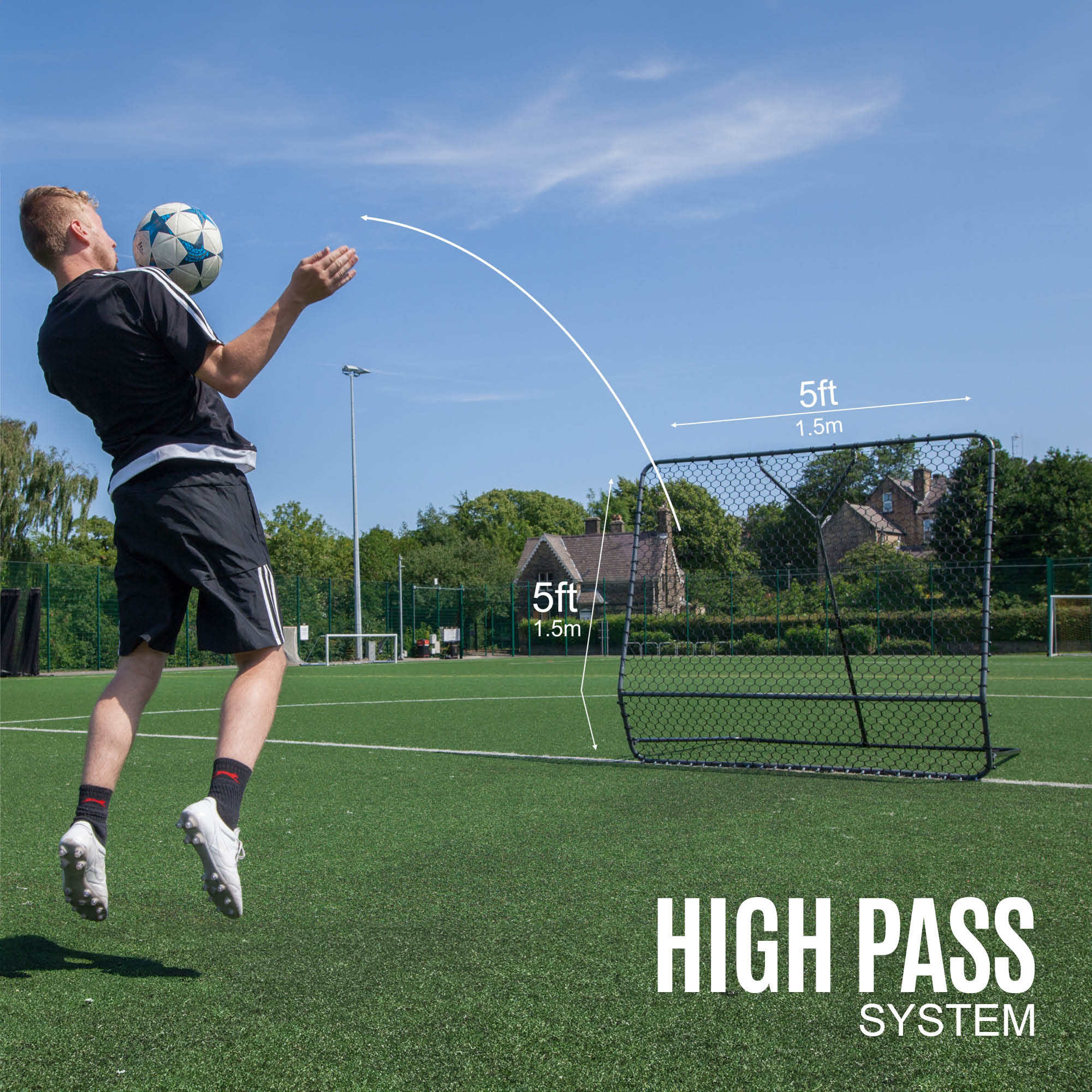 The 5x5ft face is divided for purpose: a lower zone tuned for driven ground returns and a larger upper zone that feeds controlled air passes for chest, thigh and volley work. You can link combinations back-to-back without pausing to reconfigure. When you do want to fine-tune, the adjustable face lets you set flatter one-touch passes or a steeper rebound for reaction headers and half-volleys.