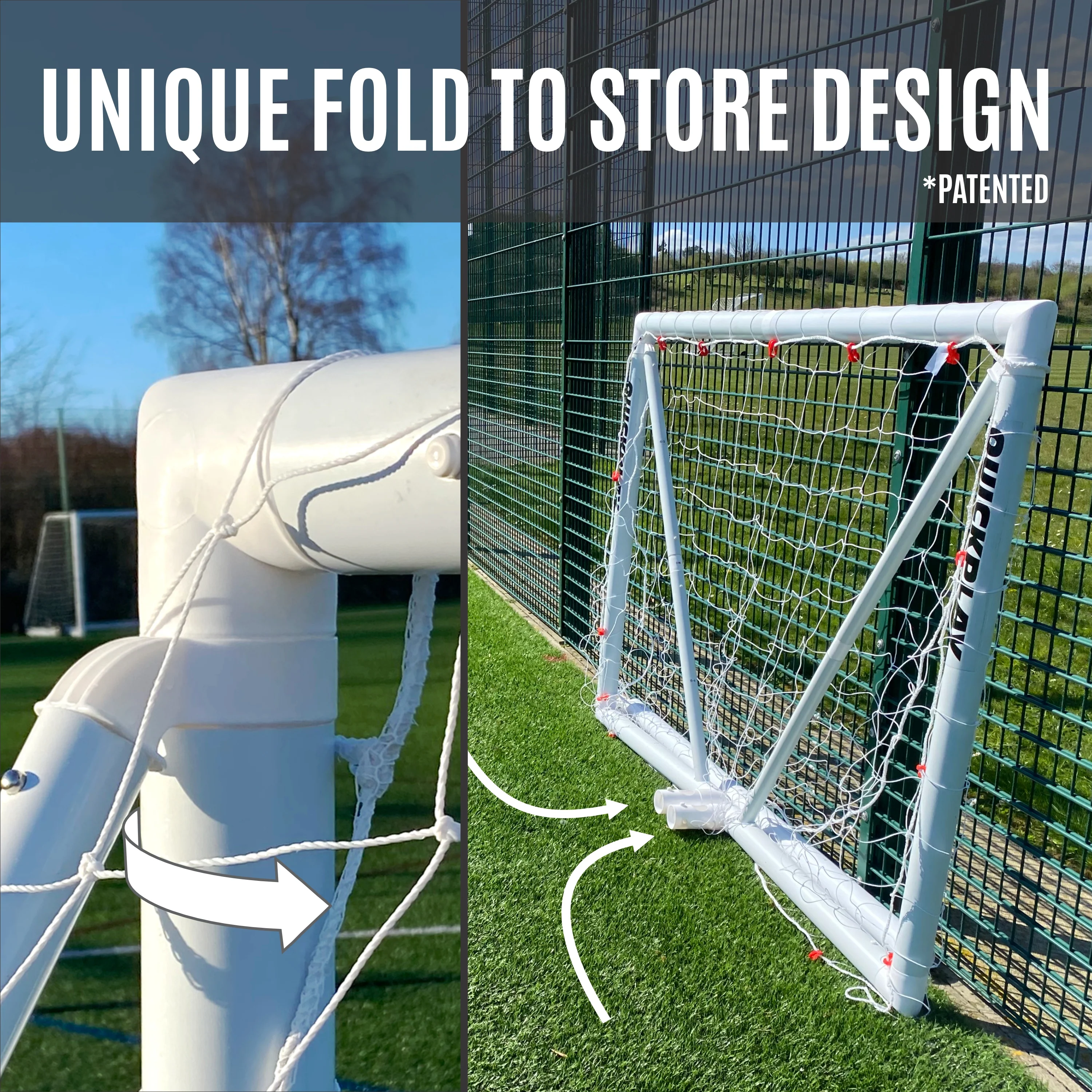 Made from 100% all-weather uPVC, the Q-FOLD 12x6' is designed for year-round use. The UV-treated 2 mm HDPE net clips on with easy-attach hooks and keeps its shape under repeated strikes. Thick, rigid posts deliver an authentic, stable feel that helps players develop confident passing and finishing. Invented and Patented by QUICKPLAY, this is dependable family engineering you can trust.