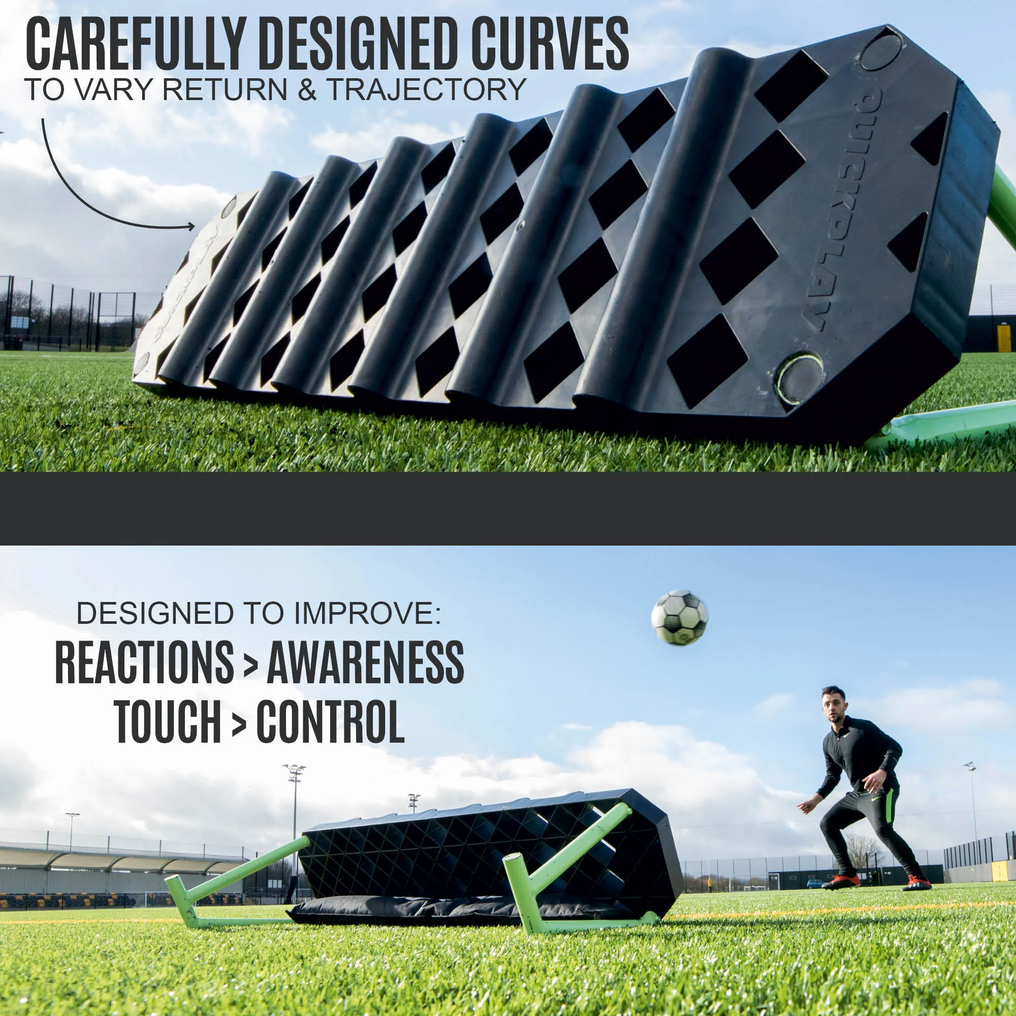QUICKPLAY REPLAY Station delivers dual-surface, dual-angle training so you can choose your focus. Use the flat face for crisp, predictable returns that sharpen ground passing and one-touch layoffs. Flip to the ribbed face for random reaction rebounds that forces quick feet, scanning, and fast decisions. Adjust the angle to work on low-driven passes, half volleys, aerial control, and first-touch out of your feet.